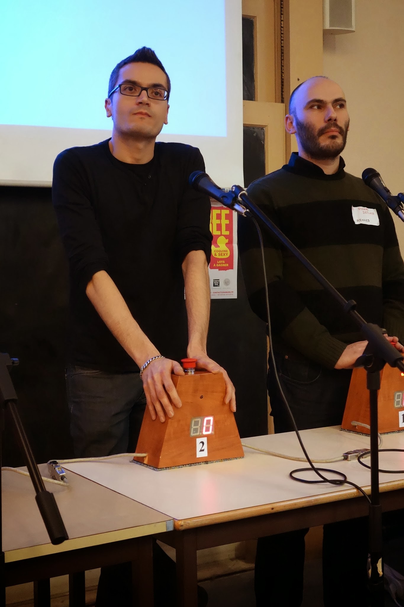 Et voici la grande finale !!! Petite surprise car c'est Benjamin qui ne sort pas du 9PG. Ensuite, Jacques trébuche sur le 4ALS et on se retrouve avec un FAF Hugues-Karim. Il se joue en 21 points et le début du questionnaire est très classique et Karim se détache avec brio 11-0 mais Hugues se bat, comme toujours, et remonte à 15-11 avec une ultime accélération du Dijonnais qui remporte la partie 21-11.