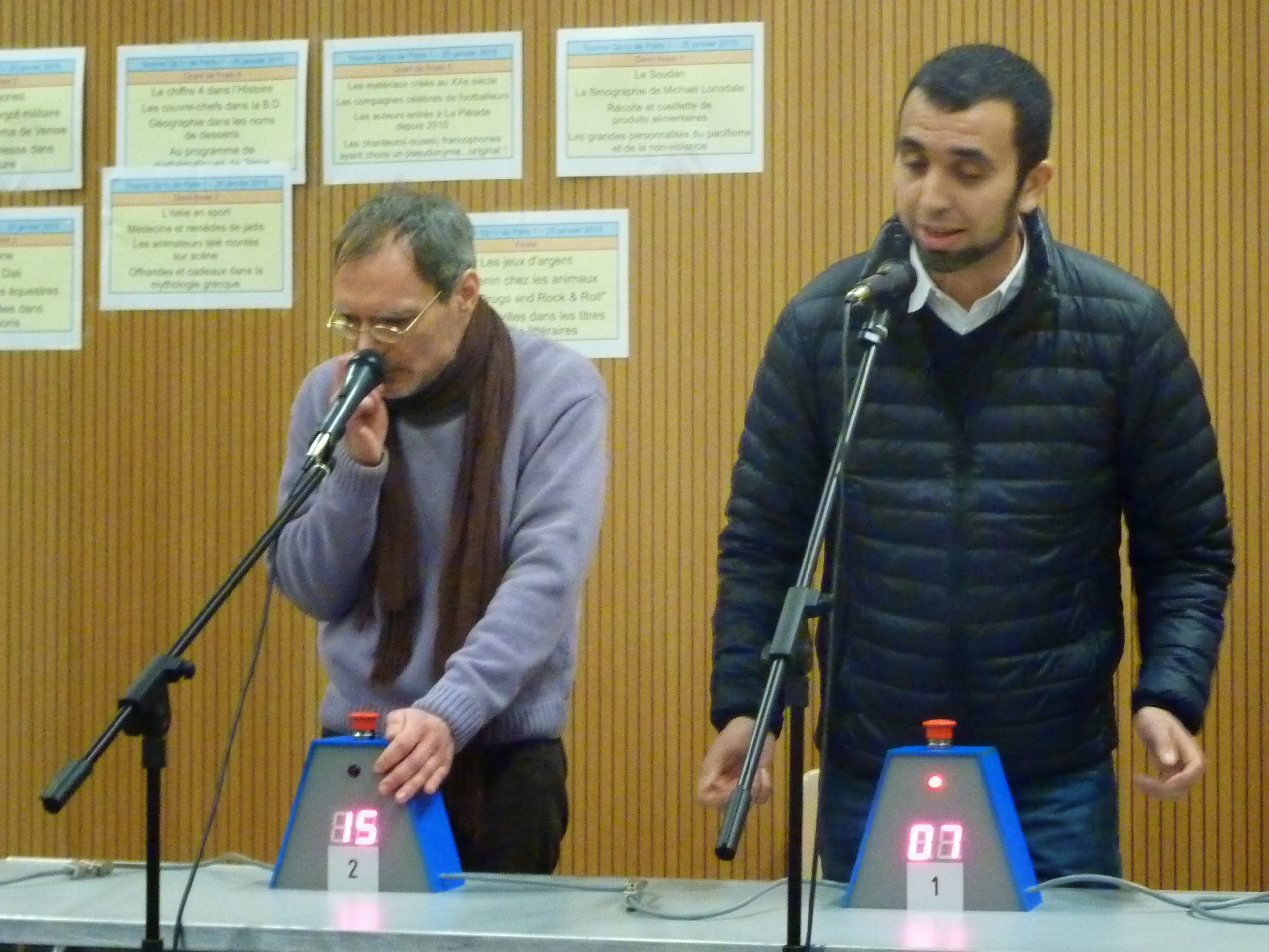 C'est parti pour notre 4è présence au tournoi de Paris et on commence avec les remerciements aux G.O. : Céline à gauche (Nenuco sur quizypedia), Lionel (yoyoseb sur Quizy), Jérôme (Chupacrow sur Quizy) puis Frédéric qui réussira à dompter son micro récalcitrant.